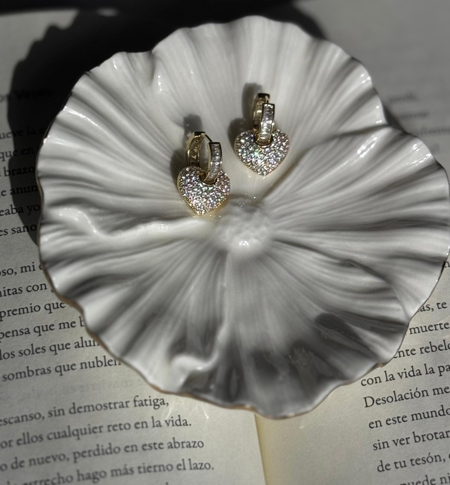 Estos aretes son la definición de elegancia romántica y brillo. Cuentan con un diseño de pequeña argolla (huggie hoop) que sostiene un dije de corazón abombado, completamente cubierto con un delicado pavé de cristales brillantes.