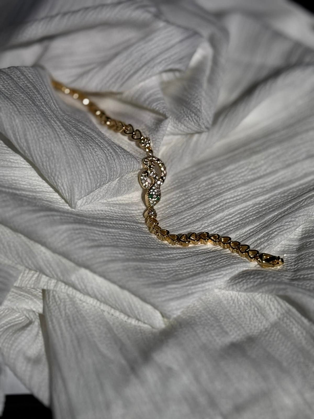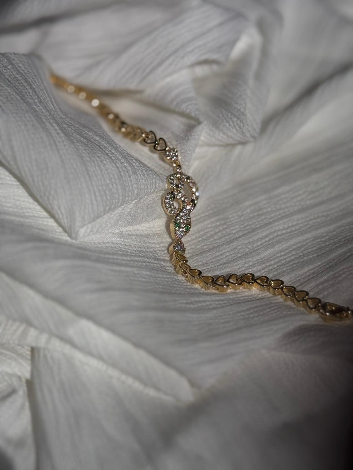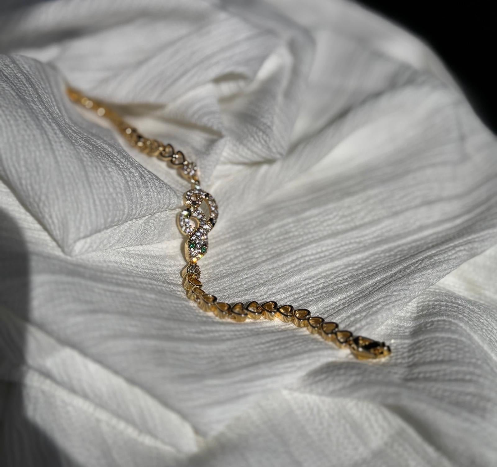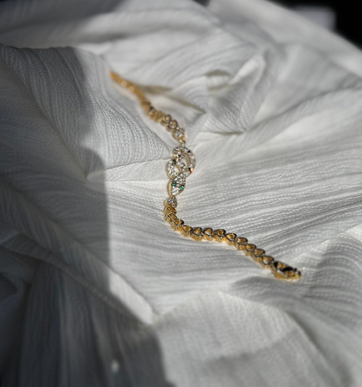 Está pieza de joyería combina un diseño clásico con toque audaz y moderno. El brazalete está compuesto por delicados eslabones en forma de corazones, creando una cadena de textura sutil y elegante en un tono dorado brillante. El punto focal es el dije de serpiente anudada, meticulosamente detallado y adorado con piedras brillantes ( probablemente circonitas o diamantes pequeños) que capturan la luz. La cabeza de la serpiente tiene un toque de color verde. Es un accesorio ideal para añadir un toque de misterio y sofisticado a cualquier atuendo.